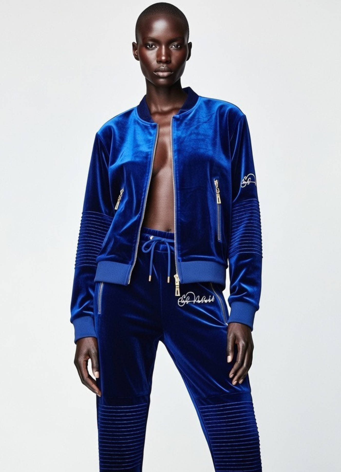 El Vélvét Women's Royal Blue Tracksuit Velour Bomber Jacket Two horizontal gold zips at the back. Two Pockets on the Bomber Jacket Velour Joggers(Cuffed) Effect Rib Knee Model is 5'5 and she is wearing a small Gold Zips El Vélvét Embroidered Logos