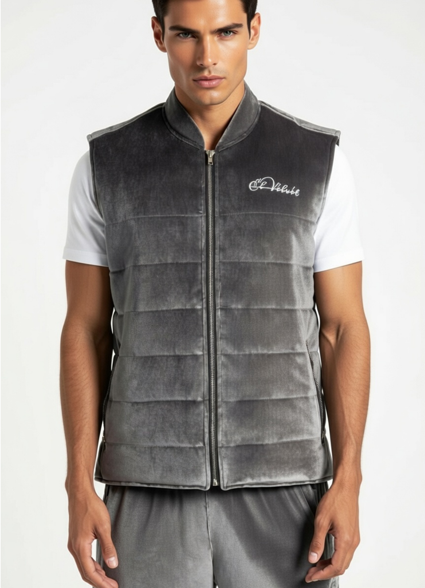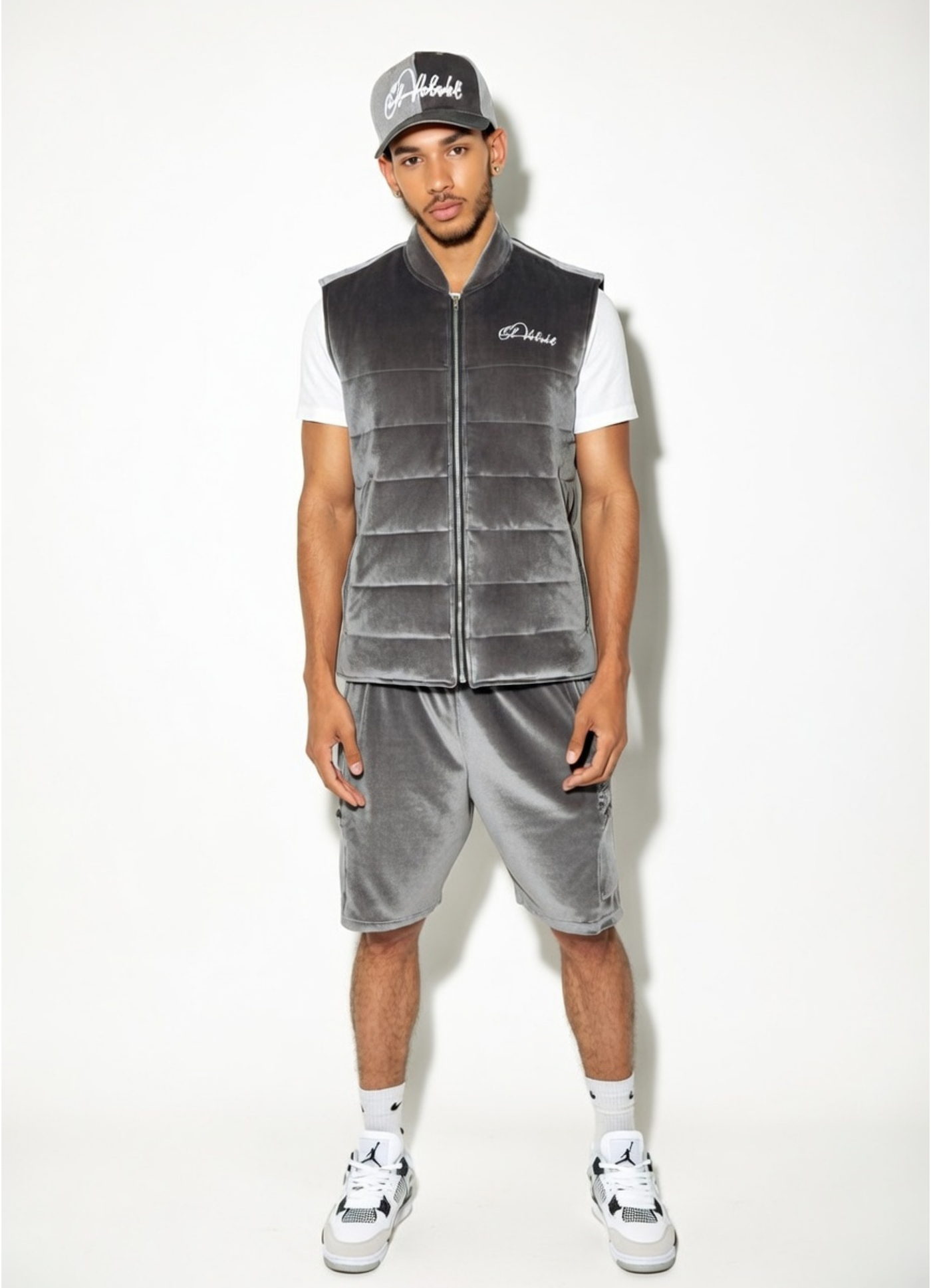 Velvet Dave Full Short SetFlat CollarGreyVelvet Padded VestEmbroidered LogoSilver ZipperSold as a Full set.Model is 5ft11 wearing a Medium.