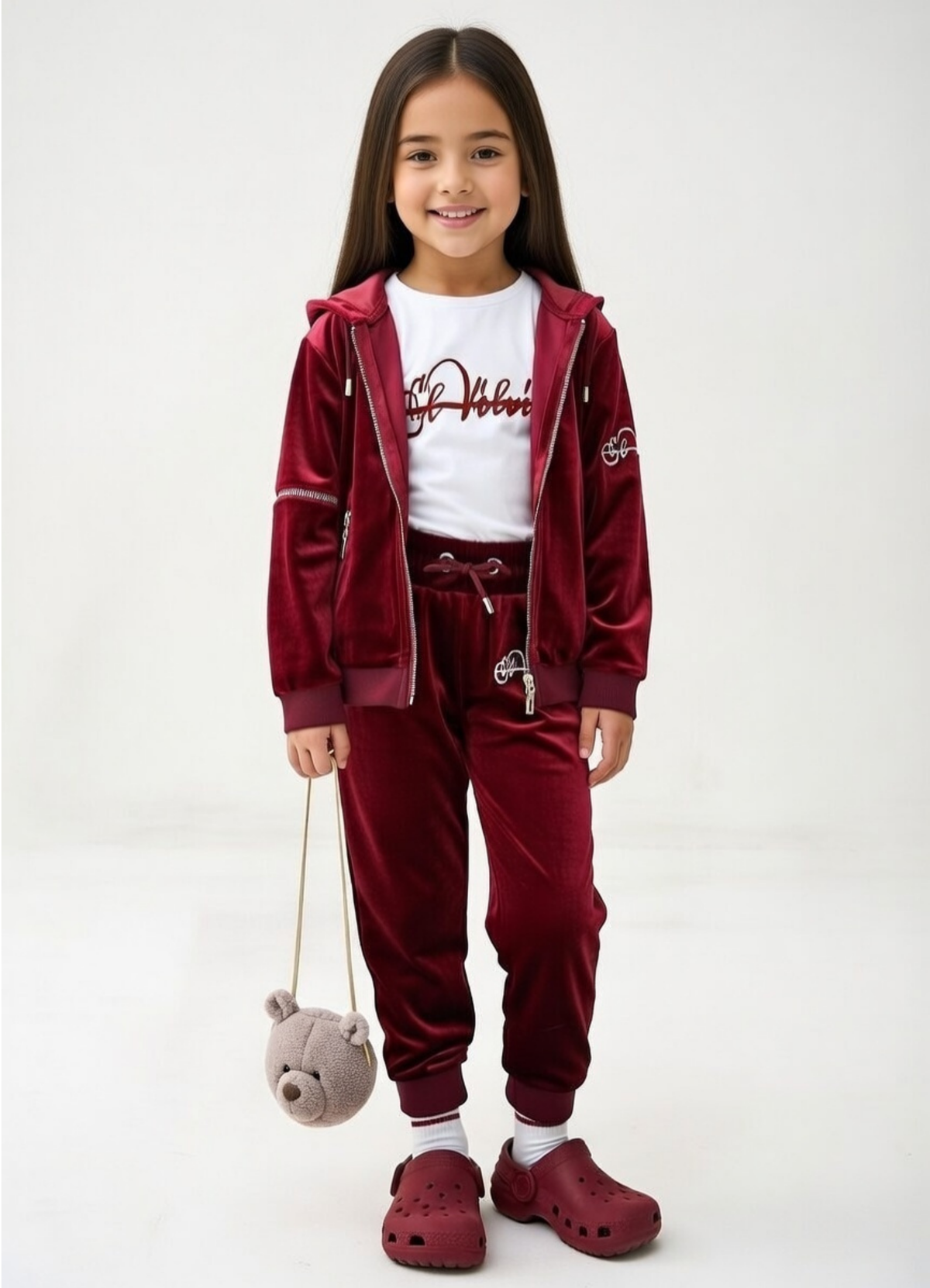 El Vélvét Burgundy TracksuitVelour Hooded Sweatshirt zip around the Sleeve,Hood&MidBackVelour slim fitted JoggersGold ZipsModel wearing 4-6 yrs